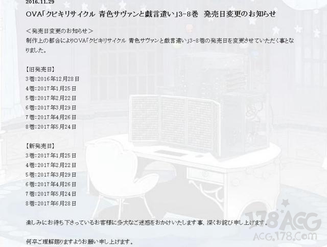 戏言的第三卷OVA延期到2017年的1月底发售,最终卷也就顺延到了2017年的6月底发售,当然如果在第三卷之后再出现延期的后,后面的动画也会继续延期推出。