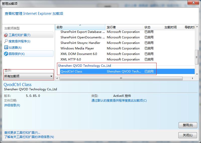 2.由于您的浏览器管理加载项中禁用了快播插件引起。解决办法:打开IE浏览器,在菜单栏工具项→找到加载项管理器→“启用”或“禁用”加载项,并在弹出的对话框中启用所有以ShenZhen QVOD 开头的加载项,