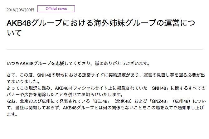 6 月 9 日,日本女子组合 AKB48 的官网移除了其官方姐妹团体 SNH48 的内容,并发布了一则让 SNH48 和 AKB48 的粉丝都震惊不已的公告。
