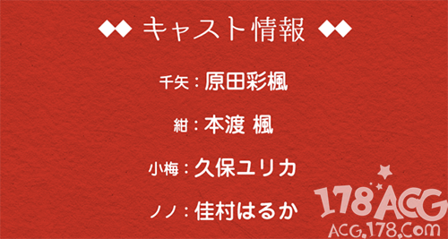 小梅的声优由「Lovelive!」中小泉花阳的声优久保由利香担任;枣乃乃的声优由「偶像大师灰姑娘女孩」中成崎美嘉的声优佳村遥担任。