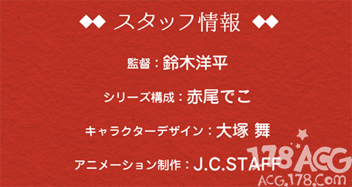 除此之外,STAFF的情报也已公开,监督为铃木洋平(「没有黄段子存在的无聊世界」),系列构成为赤尾でこ,人设大塚舞(「这个美术部大有问题!」)。动画制作由J.C.STAFF负责。
