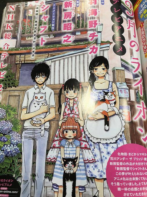 有句话叫「倒A出品必属精品」,富士电视台的动画深夜档,倒A档播出的动画一直以高质量所著称,从该档期的第一部作品《蜂蜜与四叶草》就让大家惊艳,至今《蜂蜜与四叶草》依旧是一部经典的青春动画,而《蜂蜜与四叶草》漫画作者羽海野千花的另一部漫画作品《三月的狮子》之前也已经确认要改编成真人版和动画,就在大家期待这部作品的TV 动画再次在倒 A 档播放时今天日本方面爆料《三月的狮子》将由新房昭之带领SHAFT团队改编并在NHK播出。
