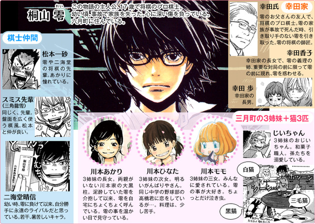 《三月的狮子》是羽海野千花从2007年开始在白泉社杂志《Young Animal》上连载的一部将棋漫画,这部漫画的将棋部分由日本九段棋手先崎学监修,这位九段棋手的流派是「无赖流」,虽然是一部将棋漫画但实际上这部作品还是着重于家人亲情人性温暖的描写,这部漫画曾经在 2009 年第二回漫画大赏中取得第三名,2011年全国书店店员选出的推荐漫画中取得第二名,2011年第四回漫画大赏,第35回讲谈社漫画赏一般部门获奖作,2014年第18回手冢治虫文化赏漫画大赏。 SUGOI JAPAN Award 2015「最想向海外介绍的日本流行文化」漫画部门第4名。而动画化也是让很多读者盼了许久。