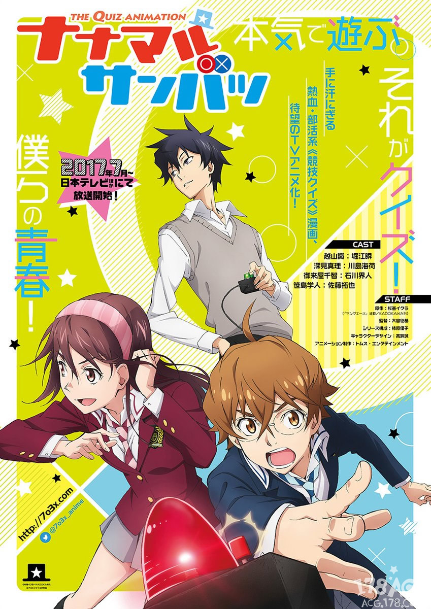 自2010年连载至今的作品「猜谜王(ナナマル サンバツ)」,改编动画版预定7月展开放送,声优名单继先前公佈的堀江瞬和川岛海荷,现在也确定猜谜研究会社长笹岛学人以及社员御来屋千智,将由佐藤拓也和石川界人配音演出的消息,动画宣传影片同步公开。