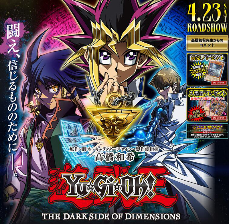 《游戏王》是1996年到2004年期间连载于《周刊少年Jump》上的人气漫画。讲述内向少年武藤游戏因为解开“千年谜团”而获得黑暗人格,卷入各种黑暗游戏的故事。《游戏王》系列的卡片也是世界上销量最高的对战卡片,并且已经被载入了吉尼斯世界纪录。衍生作品也赢得了不错的口碑。这次的剧场版《游☆戏☆王THE DARK SIDE OF DIMENSIONS》将于4月23日再日本映,3月5日起将发售附赠特制文件夹的第2弹预售票。