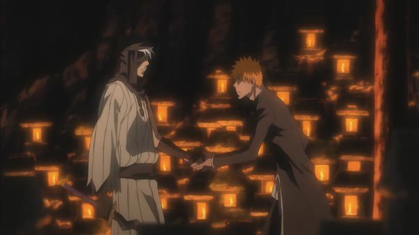 第一场战斗发生在一护的学校,学校在装修,手脚架突然倒坍,茶渡用身体挡住了掉落的东西,救了一个女孩。画面转到教室里,石田等人眼神交流后去查看现场,学校突然爆炸,出现了带着假面的敌人就是朱莲的仆人,共3个人。几人开始乱战,感到灵压的恋次和露露分头赶往学校和一护的家里,值得一提的是朱莲的仆人的战斗力的确很强,一护等人打成重伤.危难之际,恋次卍解来营救,双方打个平手,敌人撤退。