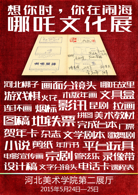 2015年5月24日至25日,想你时你在闹海——哪吒文化展将在河北美术学院第二展厅公开展出。展览由空藏动漫资料馆、熊猫工作室联合主办,河北美术学院动画学院提供支持。据介绍,哪吒文化展对哪吒文化进行了系统的梳理…