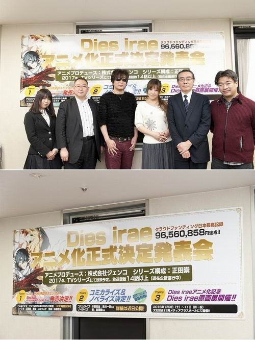 此前,美少女游戏会社light为了把2007年的18禁冒险游戏《Dies irae》推上动画化而在日本国内举办群众募资。2015年7月9日早上5点整,募资结果出炉,让本片轻松摘下两大纪录:日本国内史上最多人参加募资(已结案者)、日本国内“动画类”史上最高的群众集资金额!于是,官方在18日举办记者发表会,隆重宣布本片展开制作超过一季(至少14话)的电视动画版!
