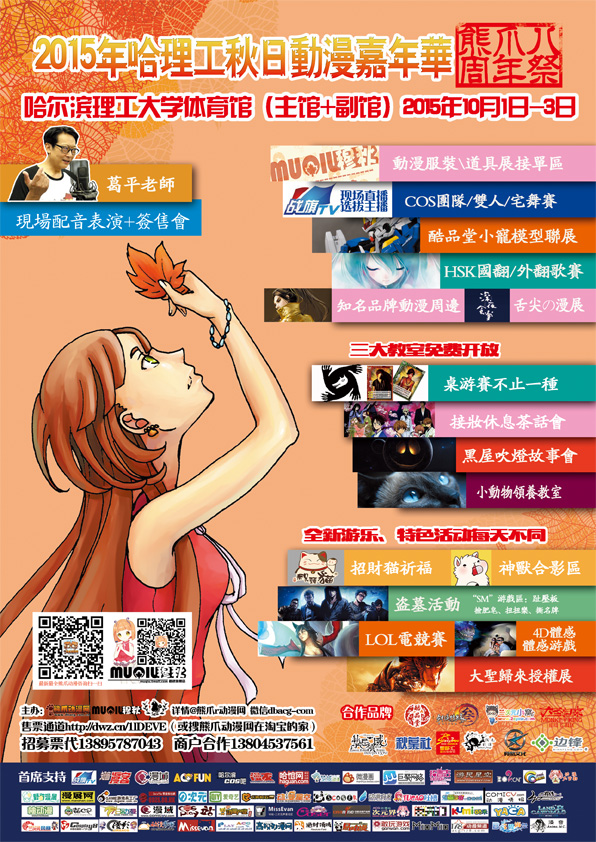 10月2日,动漫作家殿堂级元老、动漫协会主负责人安田勳将带旗下画家莉欧香,伊藤惠一郎首次来到哈尔滨,亲临2015年哈理工秋日动漫节现场,与会座谈日本动漫培训与对华外包市场,并讲述日本漫画家发展现状及日本动漫协会对华合作意向。同时,中国著名配音演员葛平老师将进行演讲和现场问答互动环节,与几千名动漫爱好者进行零距离交流。