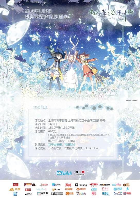 种田大法首次降临魔都!人气声优种田梨沙与花守由美里携手PONY CANYON X A1-PICTURE共同制作原创剧场动画《玻璃之花与崩坏世界》来到上海!《玻璃之花与崩坏世界》是PONY CANYON举办的动画化大赏的获奖作品《D.backup》的剧场动画化,定于2016年1月9日在日本院线正式上映,本次动画观赏会将会与日本同时上映让期待已久的粉丝朋友在第一时间体验到这部作品的魅力,当天还会有电影的相关精美周边贩售绝对不容错过。与此同时还能与本片的主演声优花守由美里、种田梨沙二位面对面交流关于本作的感想与分享一些幕后的故事,相信二位首次天朝之行也已经使各位粉丝激动不已了吧!作为特别礼物,本次活动还将举行一场迷你LIVE献给来场的各位观众!