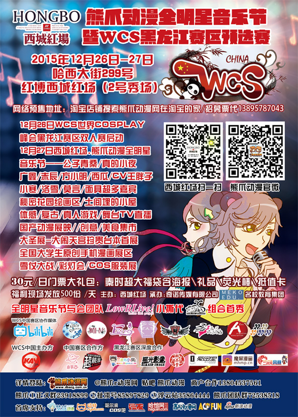 西城红场.闪耀星光熊爪动漫音乐节暨WCS世界CosPlay峰会黑龙江赛区预选赛盛大启幕! 时间:2015年12月26-27日 地点:哈西大街299号红博西城红场(2号秀场) 淘宝网络预售票地址:搜熊爪动漫网在淘宝的家 招募票务代理…
