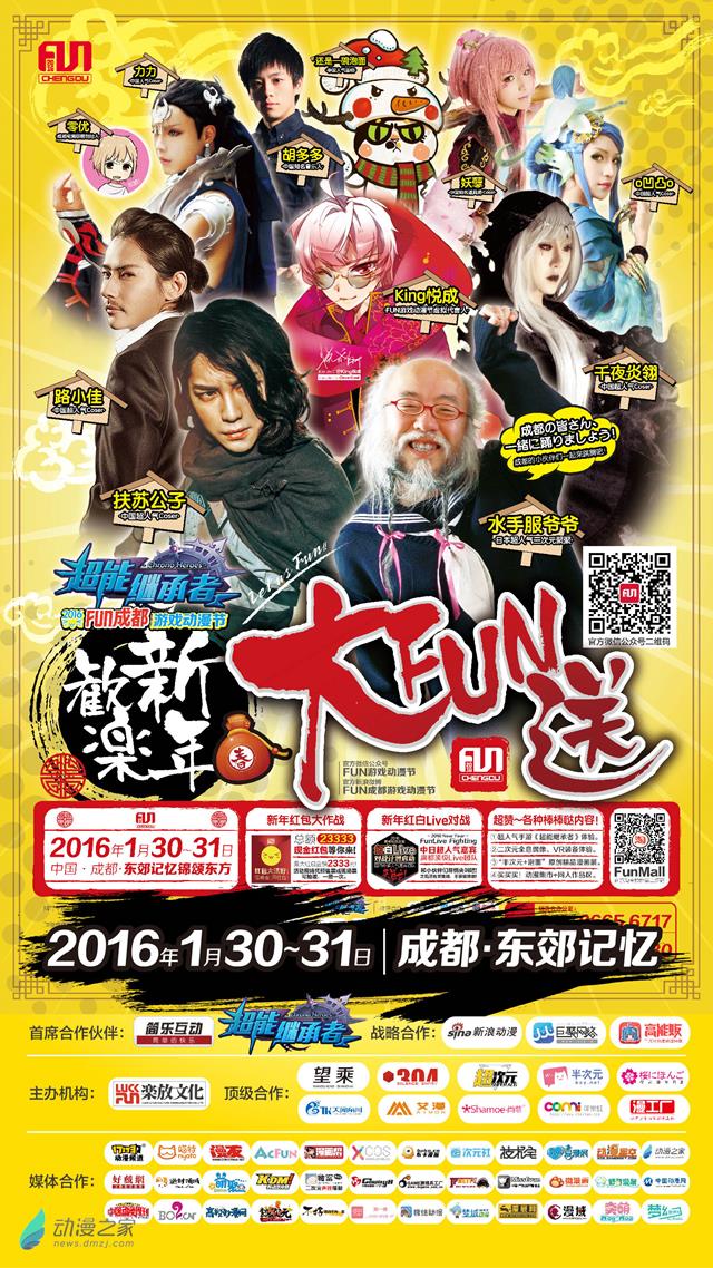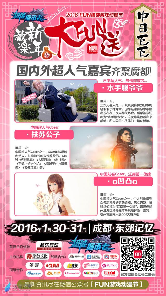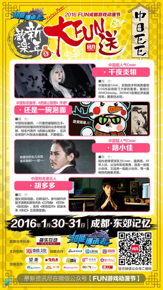 “2016FUN成都·欢乐新年大FUN送”将以新年为主题,打造年味十足的新颖漫展,小伙伴们期待已久的嘉宾阵容也已经公布,来自日本的超人气、热情奔放的水手服爷爷首次来到腐都,和小伙伴们一起卖萌。中国超人气Coser、时尚帅气的长腿欧巴扶苏公子、江南第一伪娘o凹凸o、人气Coser千夜炎翎、中国知名画师《虎啸山居图》作者还是一碗泡面、资深实力Coser路小佳、知名音乐人胡多多都将参与到活动中和小伙伴们一起提前过年!