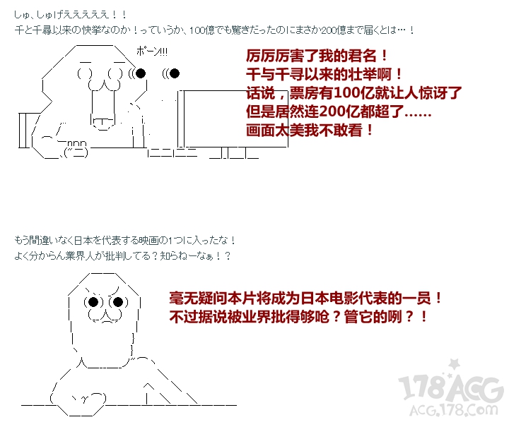 12月6日,东宝宣布,这是日本电影自从宫崎骏导演的「千与千寻」(01年)以308亿日元取得票房第一宝座后,15年来第一次票房超过200亿日元。