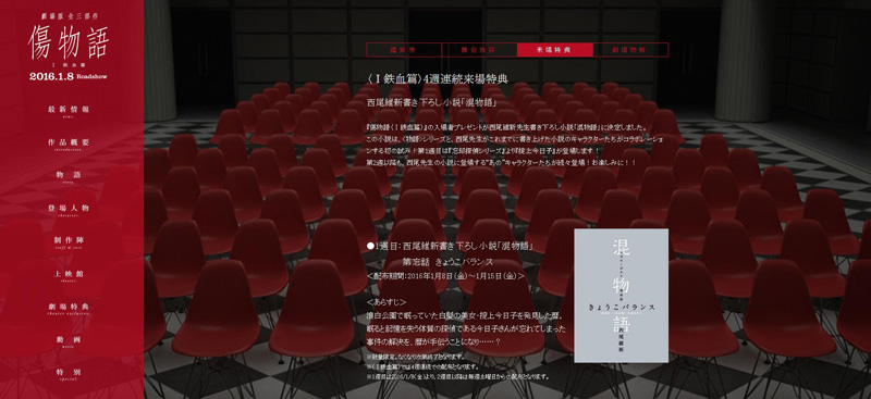 2017年1月6日物语系列第三部「伤物语」将在日本全线上映,并确定向到场者赠送前两次大受好评的西尾维新新创作小说「混物语」!而本次最终章也会连续4周赠送这份礼物。 2017年1月6日起赠送「第军话 惩罚小队」。并且2…