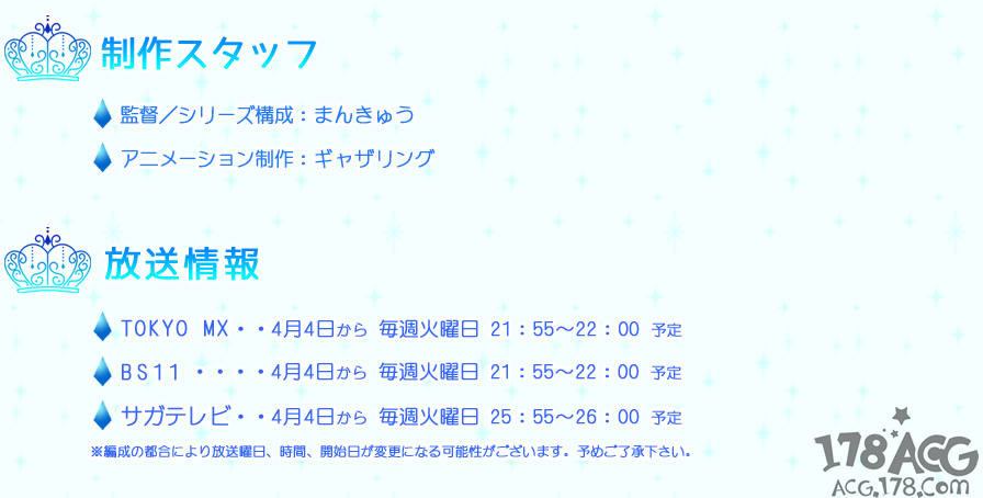 动画由Gathering公司制作,执导过「偶像大师 灰姑娘女孩剧场」、「矶部矶兵卫物语」等动画的まんきゅう担任导演和系列构成。