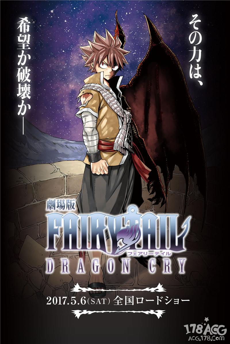 改编自真岛浩原作的TV动画电影「剧场版妖精的尾巴-DRAGON CRY-」确定于5月6日上映。本次真岛全新绘制的宣传海报公开。海报上站着半身龙化的男主纳兹,背景深暗阴沉。