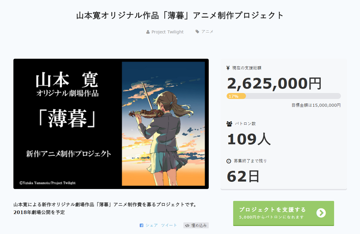 而捐 20 万日元的话可以获得与山本宽和福原香织一起去舞台原型地磐城市旅行的权力。很难说这个众筹能否成功,目前已经有几个人捐了 15000 日元。