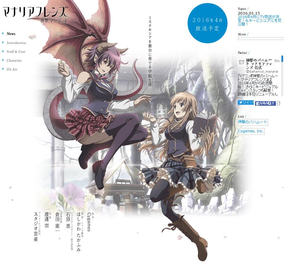 在去年 8 月时,Cygame宣布巴哈姆特将制作新动画《玛娜利亚魔法学院》,今天官方正式宣布这部动画定档在4月新番并公布了具体的制作阵容。与上次的动画相比这次完全换了一个新的制作组继续做巴哈姆特的动画,说起来最近Cygames的另一款手游《碧蓝幻想》陷入了严重的争议,不知道会不会影响《碧蓝幻想》的动画化进度。