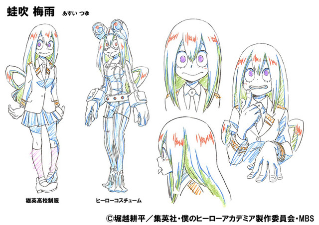 外貌像青蛙的一样的女孩子。希望被合得来的人叫做“梅雨”而不是姓,性格口无遮拦。拥有着能用舌头卷起出久、同时抱住两人并进行长距离跳跃的怪力。