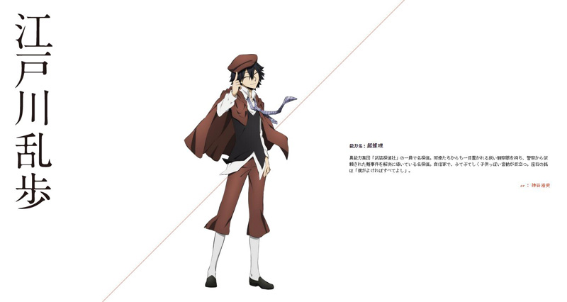 将于4月播出的TV动画《文豪野犬》公开了江户川乱步、谷川润一郎和谷川奈美的人物设定图。至此,侦探社所有成员的设定图已经全部公开。
