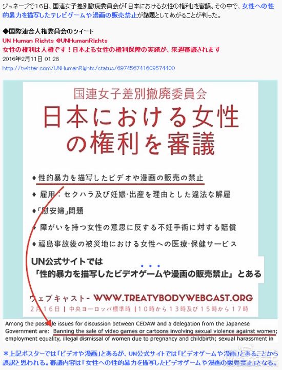 此前备受热议的联合国提议事件,近日有了最新进展。在维也纳联合国人权理事会下属的女性歧视消除委员会于2月16日正式开会专门审议『日本女性权利问题』,在这个会议上将专门审议关于日本女性权利保护的7个议题,而第一个议题就是日本的描写性暴力漫画和电视游戏的问题。